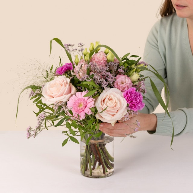 Délivrez vos plus beaux messages avec notre bouquet Bois de rose, une création florale en camaïeu rose composée de roses, lisianthus, germinis et autres fleurs variées. Ce bouquet plein de tendresse signifie votre présence en toute occasion, sur un lieu de travail comme à la maison. Et pour prendre parfaitement soin de ce joli présent et le faire durer plus longtemps, le vase est offert, inclus dans la livraison.
